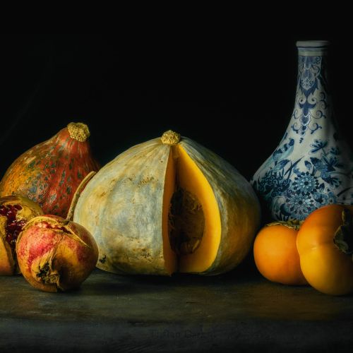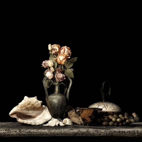 Oggetti umili, frutti, fiori e presenze animali diventano materia carica di tempo e simbolo. La fotografia assume il linguaggio della pittura non come citazione, ma come struttura: luce, composizione e silenzio costruiscono immagini essenziali, dove ogni elemento è necessario.